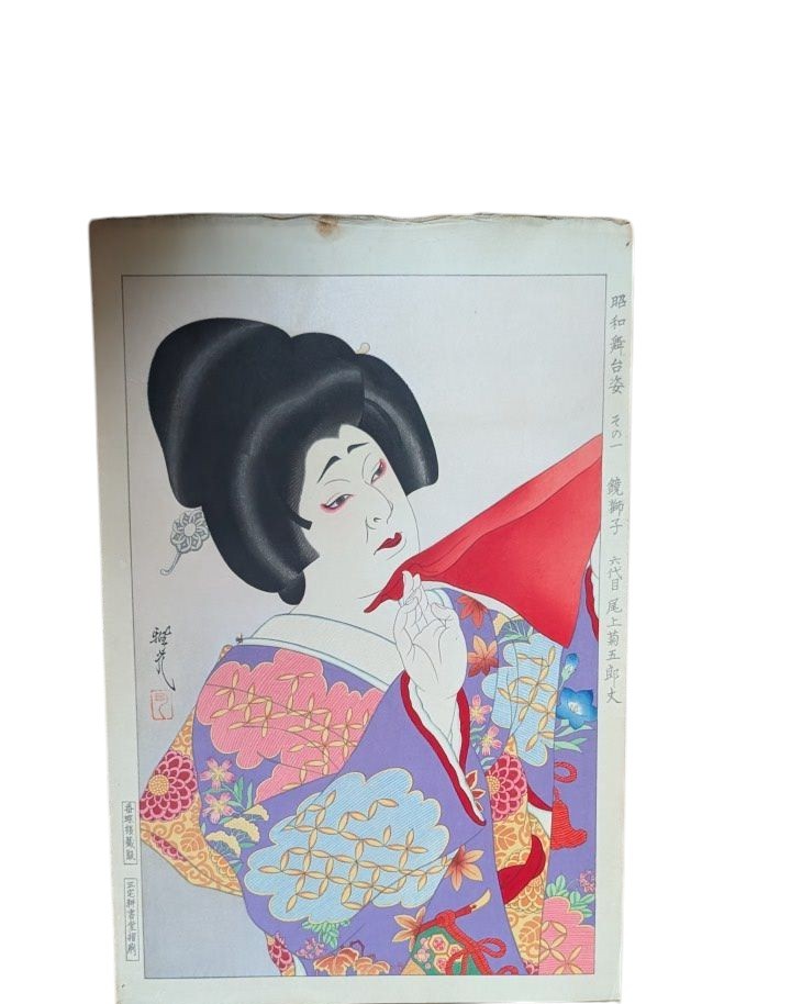 Original Japanese Woodblock Print: Onoe Baiko VII as Fuji Musume in Fuji Musume (The Western Maiden) Limited Edition (75/200). RARE; great impression with vibrant colors The print does not sell with the original brown dustcover because there are five prints enclosed in one dustcover. If a five are purchased by one buyer the original dustcover will be included along with all original inserts.